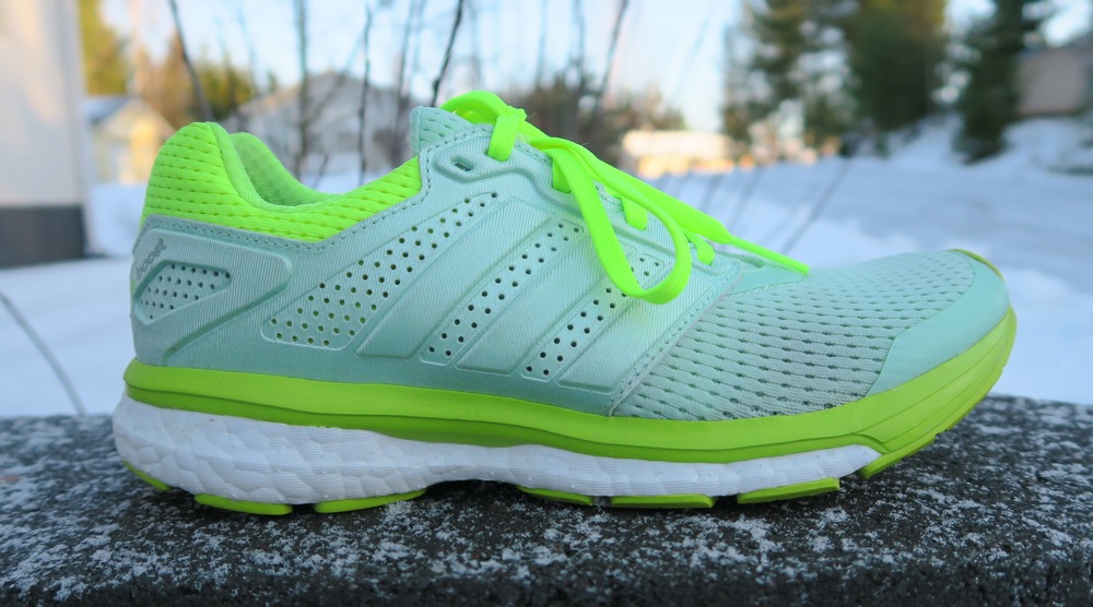 Uusimmat kenkäni ovat nämä frozen green / solar yellow:n väriset Supernova Glide Boost seiskat. Peruslenkit kulkevat niillä hyvin. Nykyään olen osannut ostaa tarpeeksi isot kengät, eivätkä varpaankynteni ole enää jatkuvasti mustat.